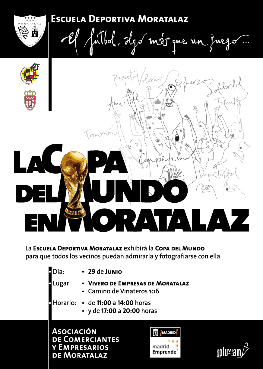 24/junio/2011 La Copa del Mundo en Moratalaz La Escuela Deportiva Moratalaz exhibirá la Copa del Mundo ganada por España en Sudáfrica para que todos los vecinos puedan admirarla y fotografiarse con ella.Día: 29 de Junio Lugar: Vivero de Empresas de Moratalaz ( Camino de Vinateros 106) Horario: de 11:00 a 14:00 horas y de 17:00 a 20:00 horas. Diseño de la gráfica: Pluviam ;·D |