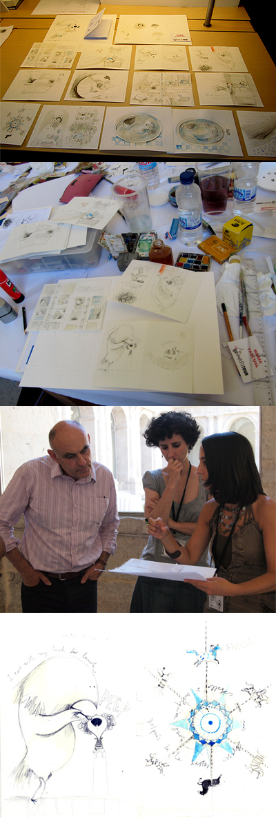 22/julio/2011 5ª edición Curso Internacional de Ilustración y diseño gráfico. Por fin hemos podido sacar un hueco para agradecer a Isidro Ferrer y a Grassa Toro el haber creado estos cursos en Albarracín, ¡y ya van cinco!.Han sido unos días intensos y enriquecedores al máximo. Del 29 de Junio al 2 de julio, reflexionamos sobre el éxito, el fracaso y todo lo demás, tuvimos el gustazo de conocer grandes profesionales que esperamos que lleguen a ser también buenos amigos y aprendimos con las experiencias de Miguel Gallardo, Javier Zabala, Pablo Martín, Paul Cox, Anette Lenz y Annik Troxler. La apuesta vital de Miguel Gallardo nos recordó cómo el pensamiento del niño funciona en un constante estado de juego. Un buen propósito el de tratar de recuperar nuestra libertad dejando que fluya el aire para que las ideas surjan. Disfrutamos del magnífico trabajo de Pablo Martín, degustando su soporte favorito de lenguaje gráfico: propuestas tipográficas invisibles construidas desde la solidez del buen oficio. No olvidaremos sus consejos. Imposible no emocionarse con las ilustraciones de Javier Zabala. Compartimos su máxima: sin una idea, no se puede articular ninguna emoción. También trataremos de enfrentarnos a nuestros miedos recordando que "success is a mind game." Un verdadero descubrimiento, Anette Lenz. Gracias por compartir tu sabiduría involucrando a toda una ciudad a través del diseño gráfico gráfico e incluyendo la historia de las personas en el proceso de trabajo. Propagamos también la frase de Charles Chaplin: "El conocimiento del hombre es la base de cualquier éxito". Grande, inmenso Paul Cox. Y tremenda la sonrisa que contagia al contemplar el resultado de su especial manera de mirar, de las reglas que inventa y de los conceptos que descubre jugando con las formas. No pararemos de jugar y esperamos ser buenos observadores para descubrir todos los tesoros ocultos que aguardan escondidos que alguien los descubra. ¡Ah! Y nos encantó ver proyectada nuestra animación de bienvenida al 2011 en la plaza mayor de Albarracín. |