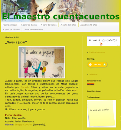 18/junio/2015 Reseña de "¿Sales a jugar?" en "El maestro vuenta cuentos. Quiero agradecer la reseña al Blog El maestro cuenta cuentosPilar y Javier Merchante, me alegra muchísimo que "¿Sales a jugar?" esté siendo un lazo que vaya uniéndonos cada vez a más y más "jugones". |