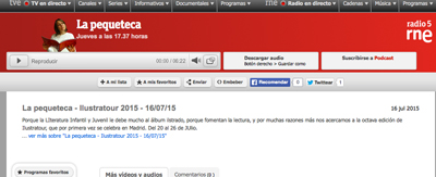 19/julio/2015 "Remover para Ilustrar" y "¿Sales a jugar?" en Radio 5 Noticias refrescantes en esta ola de calor sin tregua en Madrid. El jueves 16 en el programa de radio 5, La pequeteca, hablaron de Ilustratour 2015, de nuestro taller "Remover para ilustrar" y de "¿Sales a jugar?" |
