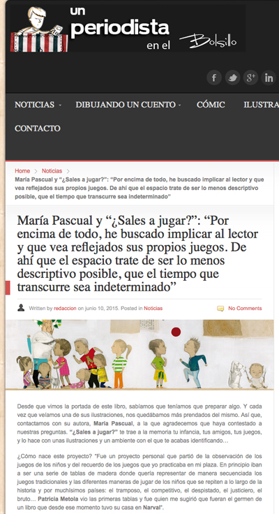 12/junio/2015 Entrevista de Un Periodista en el Bolsillo. María Pascual y “¿Sales a jugar?” Quiero agradecer a Un Periodista en el Bolsillo su entrevista sobre "¿Sales a jugar?". Muchísimas gracias por incluir este nuevo libro en su gran biblioteca. Como siempre, ha sido un placer.Podéis leerla en el blog de Un Periodista en el Bolsillo |