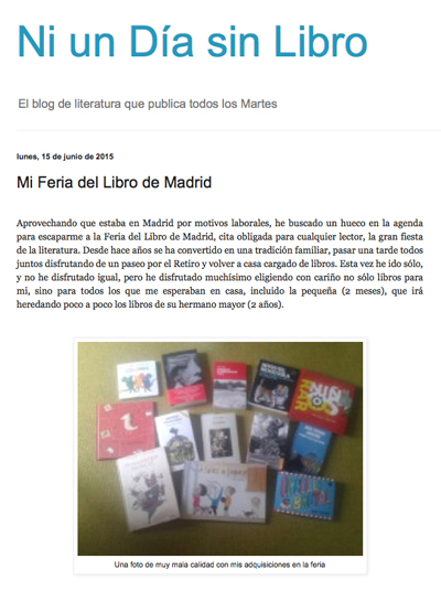 18/junio/2015 Reseña de "¿Sales a jugar?" en "Ni un Día sin Libro" Pocas cosas son más gratificantes que conocer el flechazo entre un lector y tu libro. Qué importante es el trabajo que hacen los libreros y blogs como Ni un Día sin Libro que nos permiten acercarnos a sus hallazgos y descubrir nuevas lecturas. ¡Muchísimas gracias! |