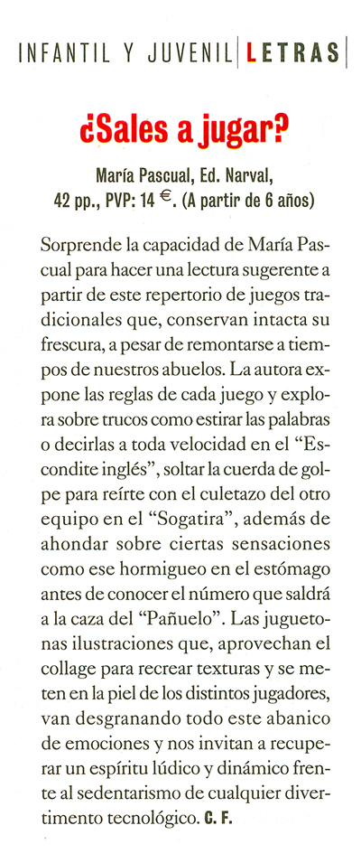 12/junio/2015 Reseña de "¿Sales a jugar?" en El Cultural (12-18 junio) Si casi todos los viernes son de por sí de mis días favoritos, éste lo está siendo doblemente. Comparto la reseña de "¿Sales a jugar?" que ha hecho Cecilia Frías en El Cultural de hoy (12-18 de junio). Muchísimas gracias por esta reconfortante sorpresa. |
