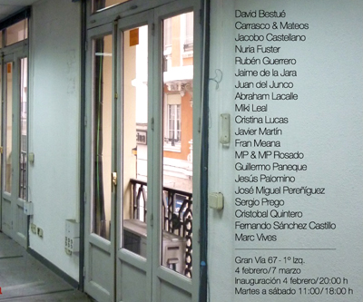11/febrero/2011 S/T. Técnica Mixta. Medidas Variables En un destartalado piso de 800 m² de la Gran Vía madrileña, Jacobo Castellano, Jaime de la Jara, y Miki Leal han organizado esta exposición colectiva en la que participan 20 artistas relevantes del panorama contemporáneo.El proyecto tiene por objeto descubrir un vacío existente en el ámbito de la actividad artística nacional. Paralelamente a la muestra se celebrarán todos los jueves por la tarde encuentros con los artistas y conciertos, y los domingos por la mañana visitas y acciones para niños. Lugar: Gran Vía 67, 1º izq.Madrid. Fecha: Hasta el 7 de marzo, de martes a sábado: 11h. a 18h. http://cociditomadrileno.blogspot.com/ |