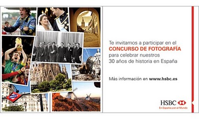 26/enero/2011 Convocatoria Concurso de Fotografía HSBC “30 años de historia en España”HSBC convoca un Concurso fotográfico que quiere recoger y premiar las mejores imágenes que definan y resuman lo acontecido en España en estos últimos 30 años. Se otorgarán tres premios a los mejores trabajos, y editará un libro con las fotografías seleccionadas. Lugar: Departamento de Comunicación y Marketing de HSBC Bank plc Sucursal en España Torre Picasso, planta 33. Plaza Pablo Ruiz Picasso, 1. Madrid 28020. Fecha: De enero a noviembre de 2011 Las bases del concurso en: http://www.hsbc.es |